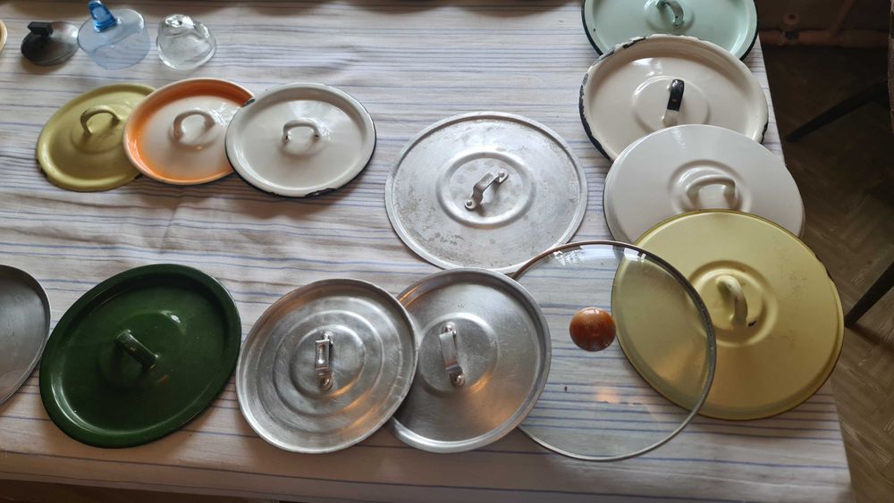 Крышки эмалированные и алюминиевые разные по диаметру, от 12 см в диаметре до 29 см в диаметре, от советских кастрюль, ведер, бидонов, также есть диаметры 27 см, 24 см, 22см, 19 см, цена от 250 тенге за маленькие до 1000 тенге за большие, цена указана за одну крышку, можно писать или звонить на ватсап