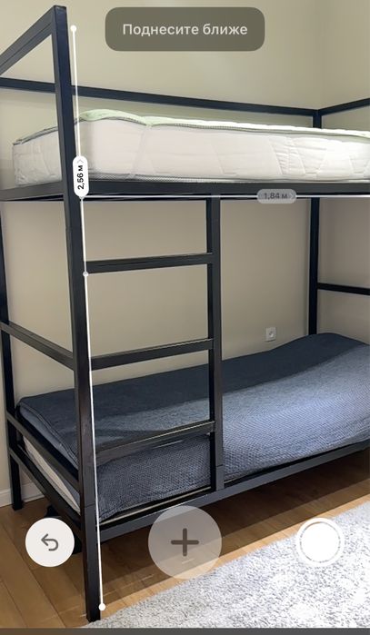 Прочная и надёжная кровать из металлического каркаса — подойдёт как для детей, так и для взрослых. Размер спальных мест: 1,84 м в длину, общая высота конструкции 2,56 м.