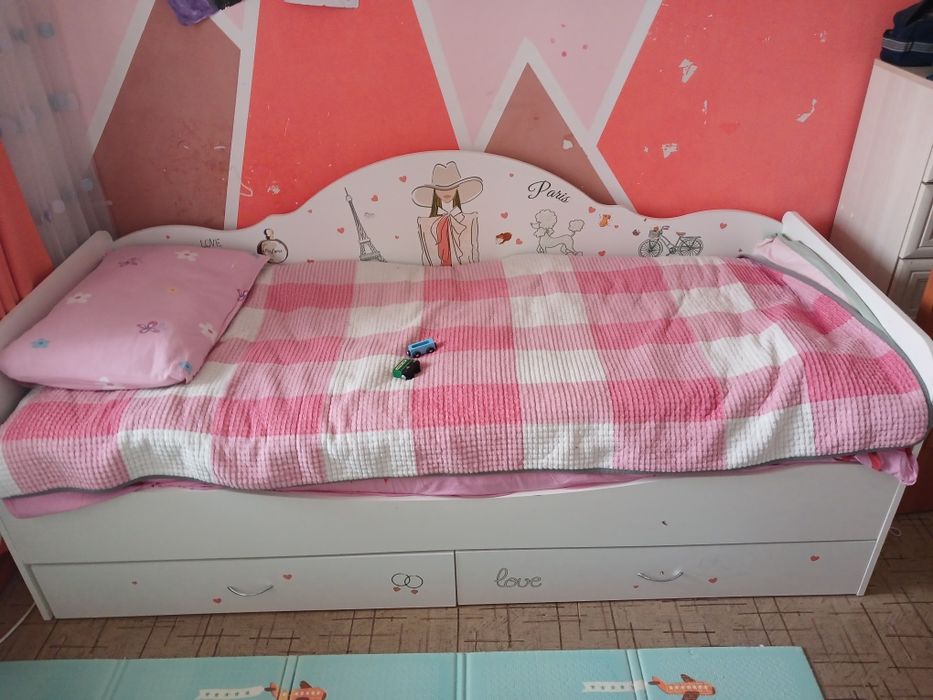 Детская кровать, шкаф, комод, стол.