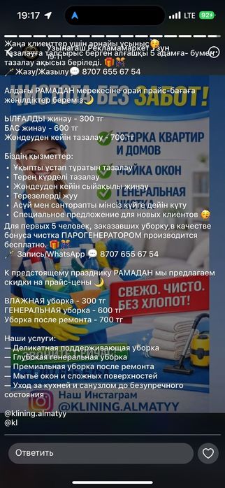 whatsapp — Уборка, клининг в Казахстане ⭐ Генеральная, после ремонта, офисная уборка, мойка окон — клининговые компании с фото и прозрачными ценами на OLX.kz