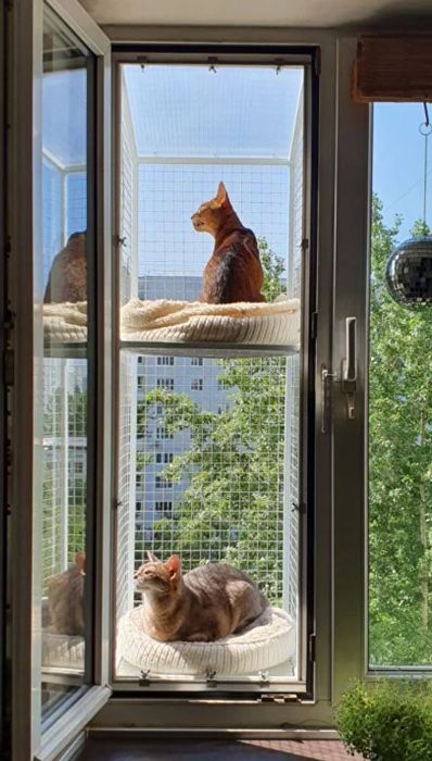 Балкон для кошек. Вольер для кошек. Кошка на окошке.